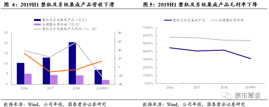 2019年整机及系统集成产品业务表现欠佳。从该项业务的营收额来看,2019年上半年营收额为7.05亿元,不足去年全年的一半;从同比增速来看,该项业务营收同比下滑至-21.24%;从毛利率来看,毛利下滑至31.06%,2018年全年毛利率为41.78%。