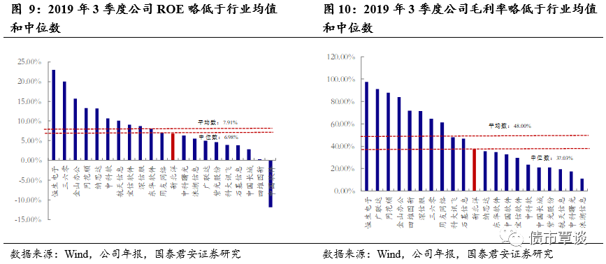 毛利率与ROE略低于行业均值和中位数。以申银万国二级行业“计算机设备”为划分标准,选取该行业市值前20家公司进行对比(加上新北洋共计21家)。2019年前三季度,新北洋的ROE为6.77%,处于第12位,略低于行业均值(7.91%)和中位数(6.98%);毛利率为37.03%,处于第11位,略低于行业均值(48%)和中位数(37.03%)。整体来看,新北洋盈利能力在行业处于中下游水平。