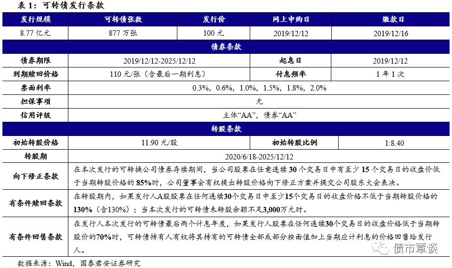 发行信息:本次转债发行规模为8.77亿元,网上申购日期为2019年12月12日,网上路演及原股东配售日为2019年12月11日,网上申购代码为“072376”,缴款日为12月16日。公司原有股东按每股配售1.3173元面值可转债的比例优先配售,配售代码为“082376”,网上发行申购上限为100万元,主承销商东兴证券最大包销比例为30%,最大包销额为26,310万元。