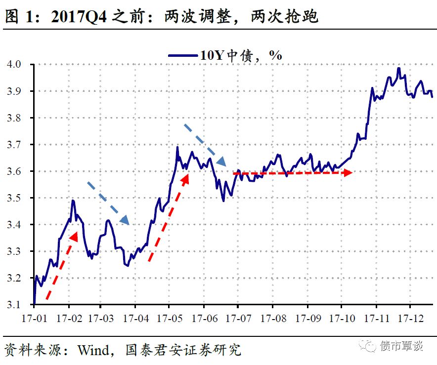 2017年Q4之前:两轮利率上行、两轮季末抢跑。截止到2017年3季度末,行情是熊市无疑,但利率上行幅度尚属温和,从开年第一个交易日算起,10Y国债的上升幅度约为50bp(3.1%-3.6%)。具体来看,两轮利率上行的主要矛盾分别来自于1季度跟随美联储的加息动作、以及2季度的监管风暴,两轮调整的上行幅度均在40bp左右;而在两个季末分别出现了两轮针对一致预期的“抢跑”,两轮波段反弹行情,利率下行幅度均在20bp左右。