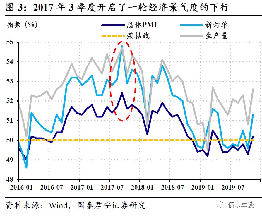 第一,投资者的思维惯性,导致市场普遍抱有“不见兔子不撒鹰”的心理。为何17Q4经济已经走弱,但市场因为担忧严监管而对经济基本面的走弱选择性忽视?因为彼时经济确定性走弱、下行拐点的出现,是事后才能被印证的。而因为思维的惯性,人在历史拐点附近时往往并不能察觉到,17Q4主流机构还停留在对于经济“新周期”或“朱格拉周期”的讨论中。反观当前,即使是对明年经济最乐观的判断,也仅是认为经济前高后低,经济只是阶段性复苏而非持续复苏。那么即使下一阶段经济数据开始走强,对债市的冲击可能也较为有限,除非预期已经开始向经济持续复苏切换,但这至少要等到2020Q2之后才能下定论。