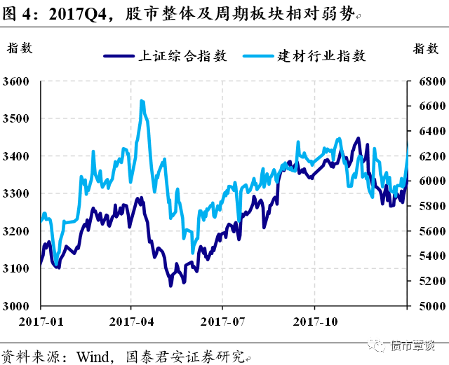 ②从时点来看,十九大召开和资管新规征求意见稿的落地均催化了债市的暴跌行情。对于十九大而言,从三季度偏弱的上证综指以及钢铁、建材等周期板块来看,十九大对于债市的影响,并非简单的重要会议提升风险偏好这么简单,更可能是市场预期重要会议之后、维稳降低,金融监管可能加码,这种预期也与趋紧的资金面形成了某种程度的互相“印证”。