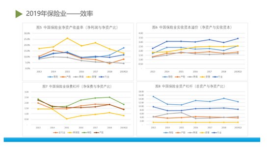 谈到效率,一般包括净资产收益率(净利润与净资产比)、保费杠杆(净保费与净资产比)、实收资本溢价(净资产与实收资本比)、资产杠杆(总资产与净资产比)等,图4给出2013年以来的保险大牌照效率情况。