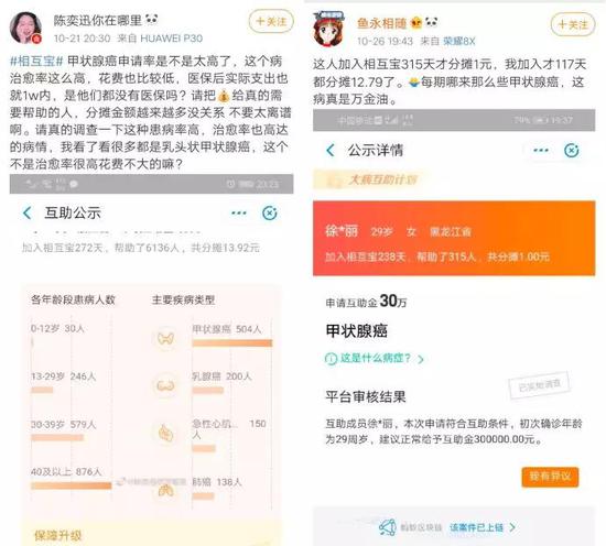 在保险和互助行业中,针对甲状腺癌的赔付比重,也一直居高不下。例如,相互宝社群成员的月均分摊金额每月递增,而约25%的救助案例都是甲状腺癌。这引起了部分相互宝成员的不满,也是相互宝这次调整规则的源起。