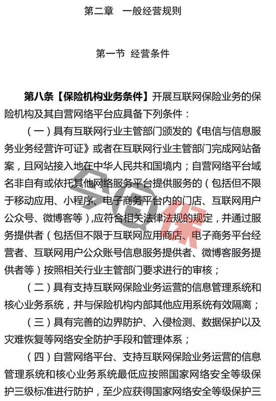 1. 经营条件。规定了保险机构经营互联网保险业务以及设立自营网络平台的条件及要求等。