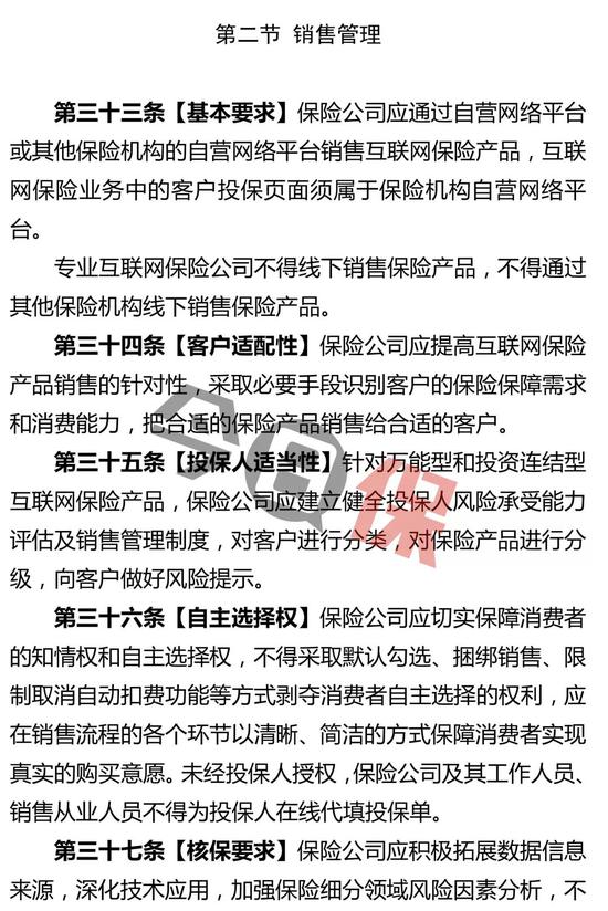 2. 销售管理。规定了投保页面、专业互联网保险公司销售、客户适配性、投保人适当性、自主选择权、核保承保、促销活动、保费收支、续保、人员和单证管理等。