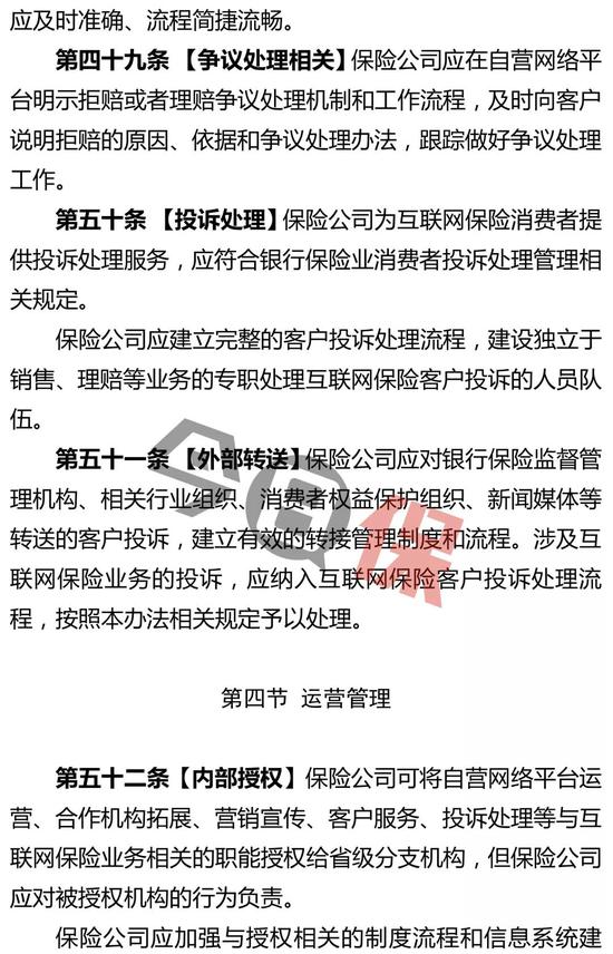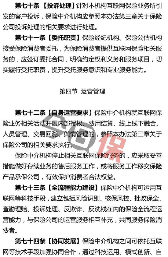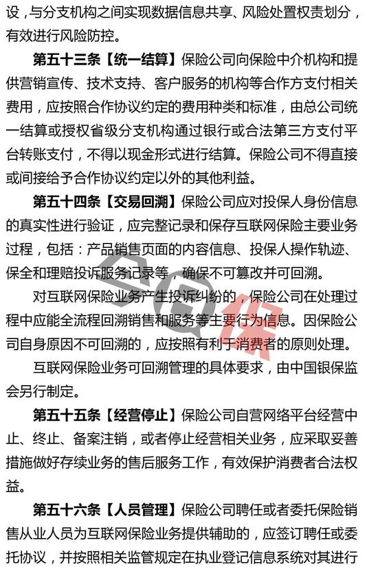 4. 运营管理。规定了内部授权、统一结算、服务管理、交易回溯、经营停止、人员管理、与保险中介机构合作等。