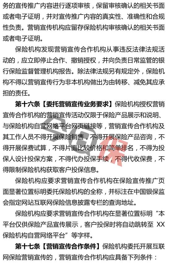 2、有收有放,分类处置。一是明确具有场景流量优势的互联网平台可以作为“营销宣传合作机构”。根据一行两会一局《关于进一步规范金融营销宣传行为的通知》精神,借鉴英美日等发达保险市场经验,规定营销宣传合作机构参与保险活动仅限定于根据持牌保险机构委托,从事展示、说明和网站跳链等营销宣传活动,并明确规定不得从事保险销售咨询和相关禁止行为。