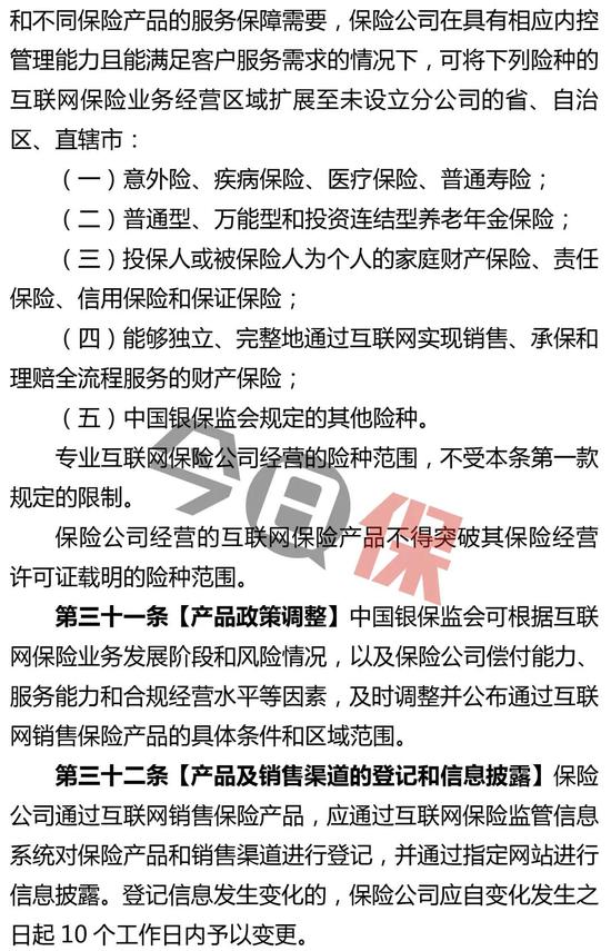 一是银保监会根据互联网渠道特点和不同互联网保险产品的服务保障需要,规定可以通过互联网扩展经营区域的保险产品种类,中国银保监会后续可根据公司经营情况(偿付能力、服务能力、合规水平等)发布互联网保险产品分级分类管理具体政策。