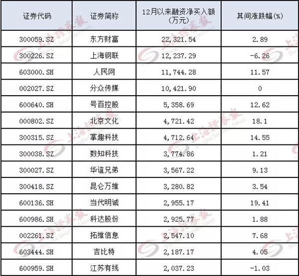 数据显示,12月以来,共有14只个股融资余额增长超过2亿元,其中隶属电子、计算机行业的科技股就多达10只。