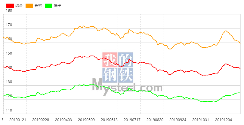 12月17日,国内钢材指数(Myspic)综合指数报141.57(绝对价格指数3999.3),较上一交易日下跌0.41%。其中,螺纹钢指数报154.95(绝对价格指数3916.8),较上一交易日下跌0.78%;热卷指数报138.76(绝对价格指数3890.4),较上一交易日下跌0.22%。