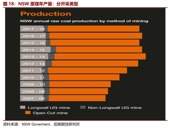 按开采类型来看,根据政府数据显示,2017-2018年QLD共产出0.89亿吨动力煤、1.6亿吨炼焦煤,其中99%的动力煤和81%的炼焦煤均为露天矿开采而来。