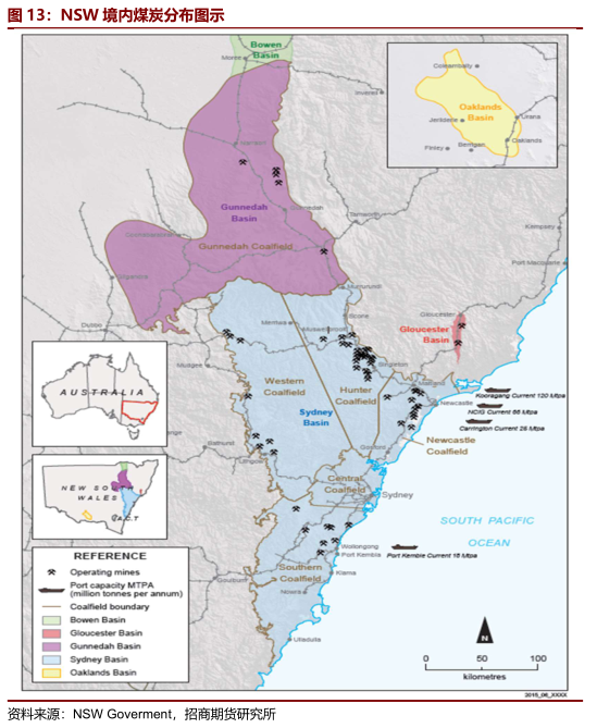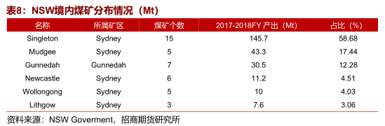 根据区域分布来看,NSW内共有四个产煤盆地,Gunnedah、Sydney、Gloucester、Oaklands,其中Sydney(Singleton/Mudgee/Newcastle/Wollongong/Lithgow)和Gunnedah Basin为主要煤炭产区。