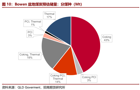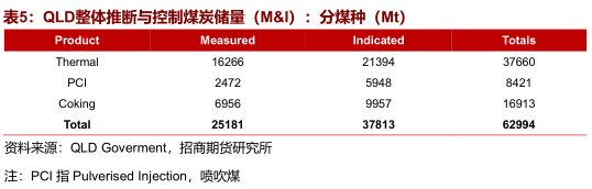 按煤种来看,QLD境内煤炭中,炼焦煤(焦煤 喷吹煤(PCI: Pulverised Injection))大约有25Bt,占比39.68%,主要分布于Bowen Basin,少量分布于Maryborough Basin;动力煤大约有38Bt,占比60.32%,分布于除Maryborough Basin外的其他矿区,其中Galilee/Surat Basin为主产区。