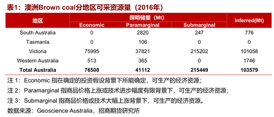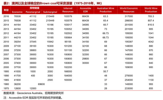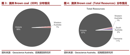 澳洲Brown coal分布于南澳、西澳、Tasmanla、昆士兰以及Victoria地区。目前澳洲Brown coal仅在Victoria地区开采,且均用于国内(Victorian)电厂,并不出口。截至2016年,澳洲褐煤的探明可采经济储量(EDR)由12年的44164Mt增加至76508Mt,预计可供使用1000年。