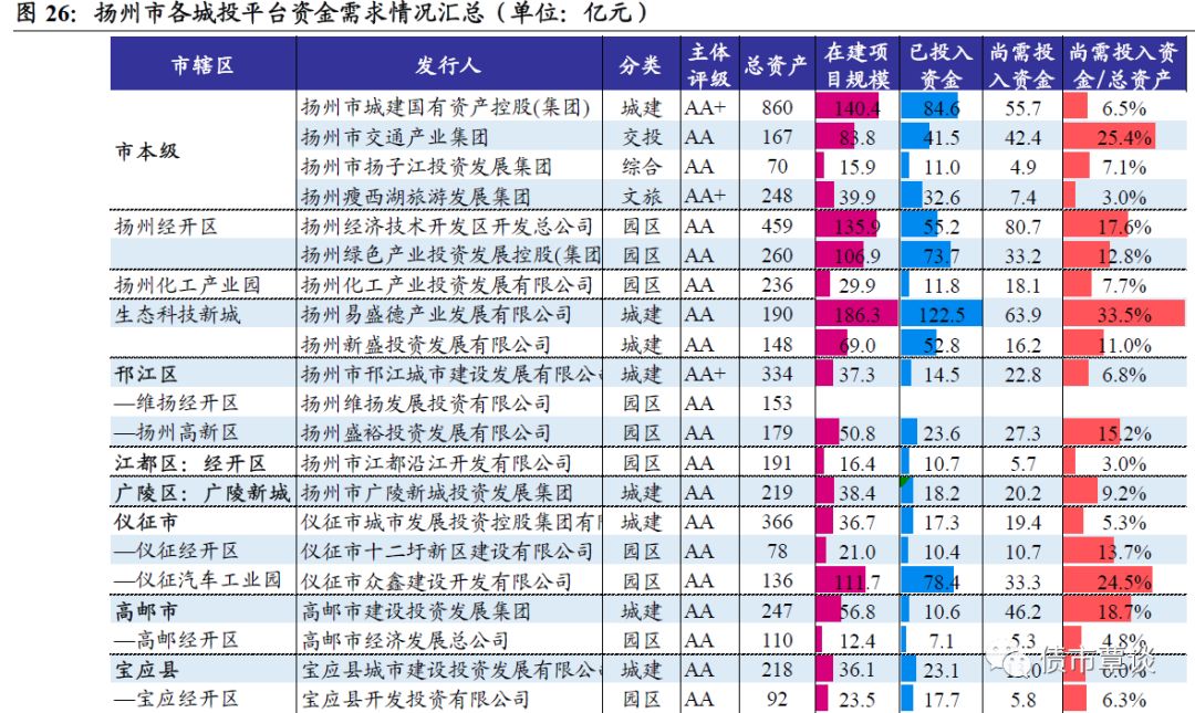 扬州市各城投平台对外担保、银行授信、政府补助、在建项目规模和未来投资压力情况梳理与对比。
