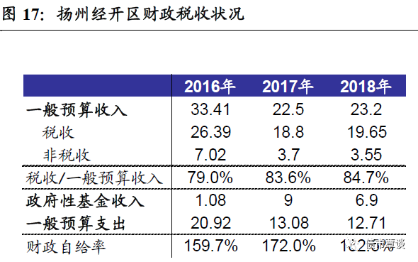 18年经开区GDP为655亿,名义增速9.34%;完成投资164.1亿,同比-21.7%;实现规上产值860.5亿,同口径上升12.9%。一般预算收入23.2亿,增长3.1%,其中税收19.65亿占比84.7%,受营改增和减税等影响,税收下滑较多;政府性基金收入6.9亿,较17年下降23.3%;预算支出12.71亿,增速下滑2.8%,财政自给率182.53%,自给率很强。18年经开区土地出让面积总计1332.32亩,同比11.46%,出让收入总计29.44亿,增长70.38%,商住用地出让均价达571.14万元/亩。