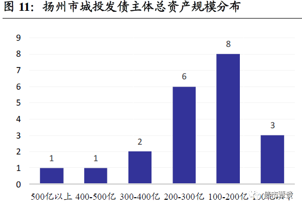 从城投发债企业资产规模看,多数平台资产规模在300亿以下,其中,500亿以上有1家、400-500亿区间有1家,300-400亿区间有2家,200-300亿、100-200亿区间数量最多,分别有6家和8家,资产在100亿以下有3家。