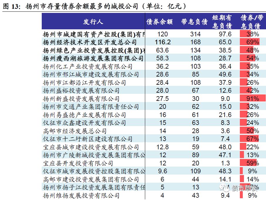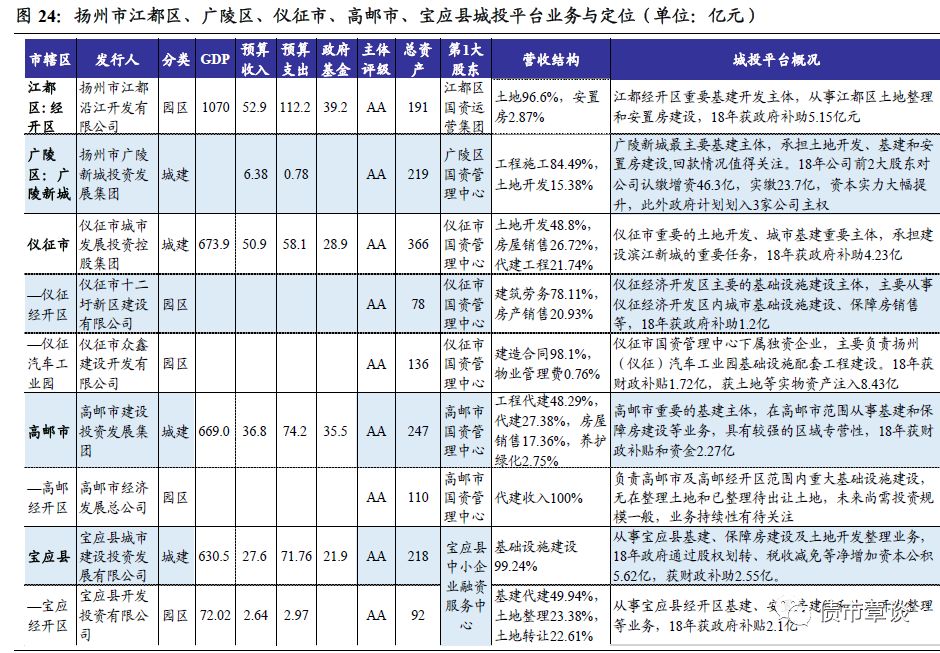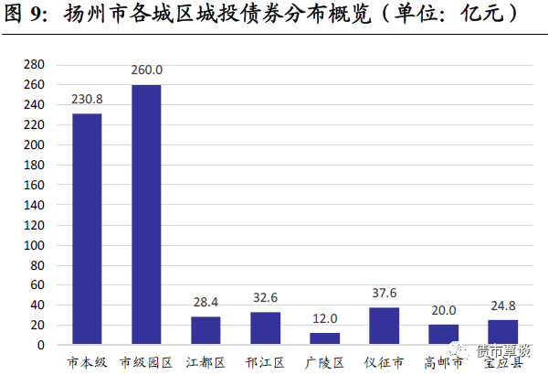 从区域分布看,市本级平台数量5家,债券余额230.8亿,占比35.7%;市级园区(经开区、高新区、化工园区、生态科技城)平台数量5家,债券余额260亿,占比40.2%;下辖的广陵区、邗江区、江都区平台各1家、2家和1家,债券余额分别12亿、32.6亿和28.4亿;宝应县、高邮县和仪征市债券余额分别24.8亿、20亿和37.6亿,合计占12.8%。