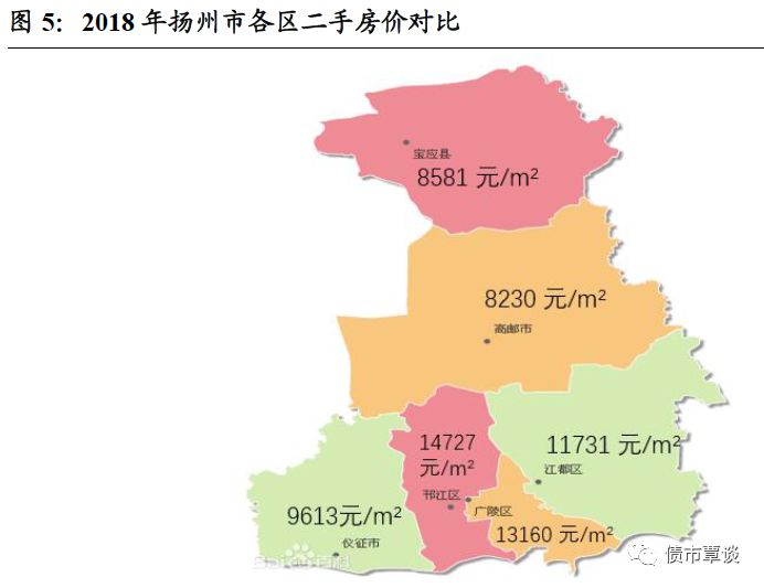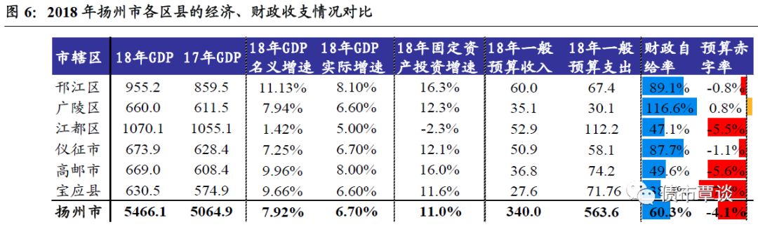 从财政实力看,①扬州市各区县财政实力差异较大,邗江区一般预算收入最高为60亿,江都区、仪征市也在50亿以上,而宝应县最低仅27.6亿;②以“一般预算收入/支出”衡量的财政自给率看,广陵区超过100%,邗江区、仪征市也在80%以上,而宝应县财政自给率低于40%,对补助的依赖度高。