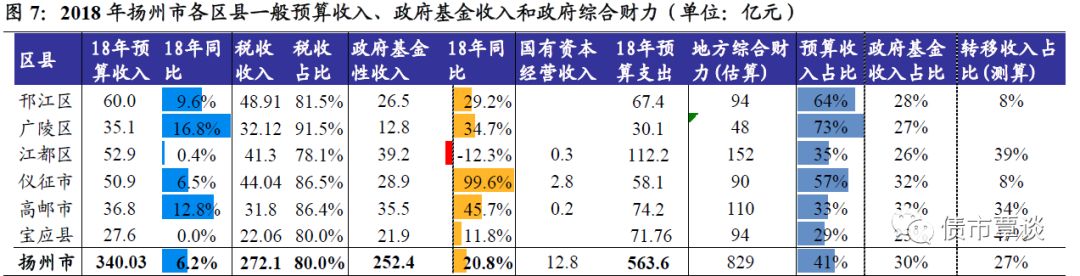从18年地方综合财力和来源结构看,①从综合财力看,除广陵区外,各区县综合财力均在90亿以上,其中江都区最高达152亿,广陵区较少为48亿;②从18年政府性基金收入看,超过30亿的区县只有江都区、高邮市,其余区县相对较少。