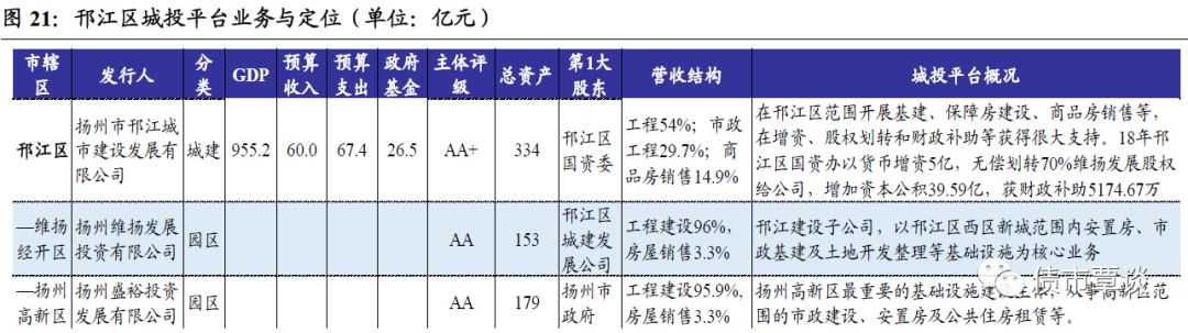 邗江区城投发债企业有2家,核心平台为邗江建设(AA+),从事扬州市邗江区范围内的基础设施和安置房建设商品房销售等;另一家维扬发展(AA),也是邗江区重要基建主体,目前主要以邗江区西区新城范围内安置房、市政基础设施建设及土地开发整理等基础设施为核心业务。
