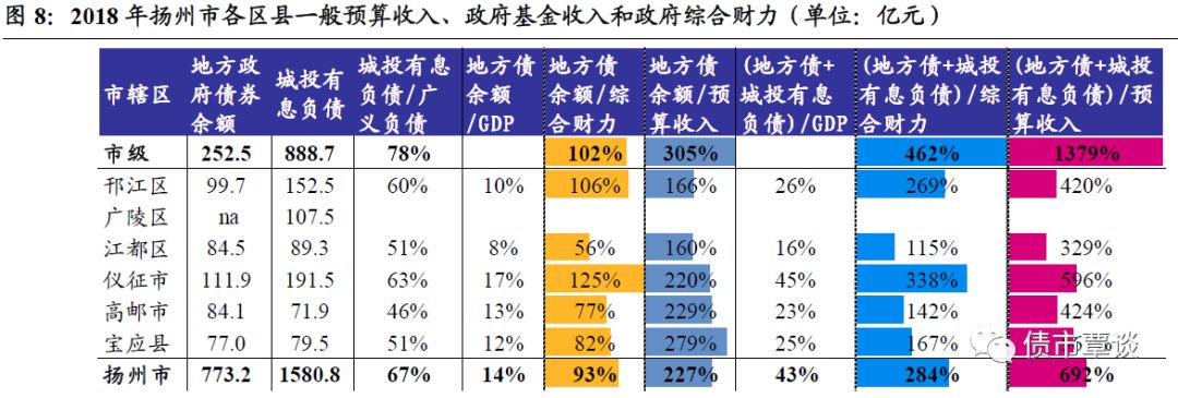 从地方债务水平看,2018年末扬州市地方债务余额为773.2亿,其中市级地方债务余额252.5亿,地方债务余额/GDP为14%,地方债务余额/综合财力为93%。从各区县债务水平看,市级地方政府债务余额252.5亿,占全市33%,与综合财力和一般预算收入的比分别为102%和305%,相对较高;其次,仪征市地方债务率水平也排名靠前。