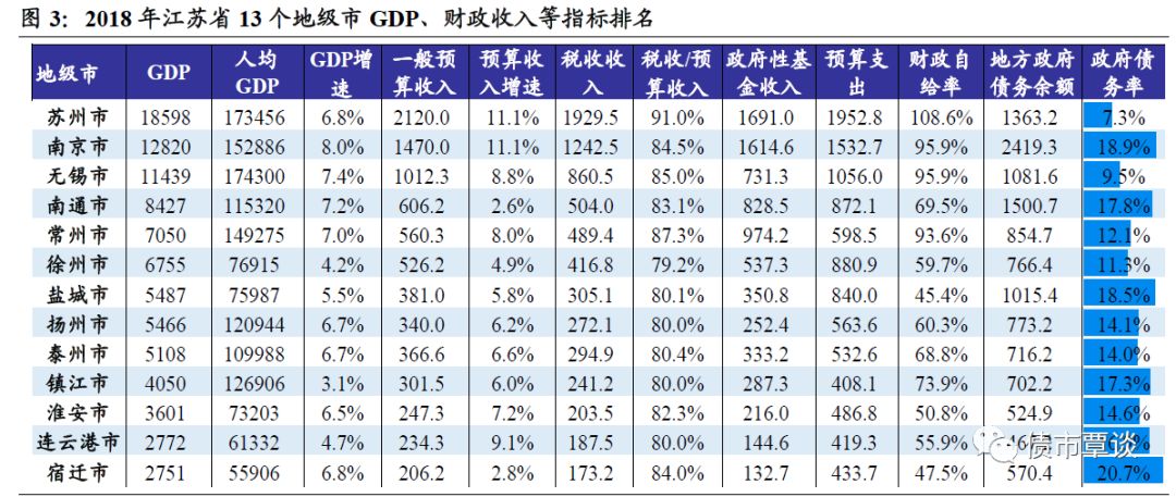 仪征市是扬州市代管县级市,位于江苏中部,东连扬州、南与镇江、南京隔江相望,是宁镇扬三城之间的节点城市。面积857平方公里,下辖9个镇、137个行政村,人口56.6万。为2019年度全国综合实力百强县市、全国科技创新百强县市。18年GDP为673.94亿,按可比价增长6.7%,人均GDP达11.8万元,是全国均值的183.16%;固定资产投资307.95亿,增长12.1%,增速有所放缓。三次产业结构为3.5:51.6:44.9,仪征市工业主要集中在化纤产业、汽车装备制造业和船舶等产业。2018年规模以上工业总产值1048.4亿,同比9.1%;一般预算收入50.92亿,增长6.5%,其中税收44.04亿占比86.5%;政府性基金收入28.91亿元,猛增99.7%;一般预算支出58.09亿,财政自给率为77%。2018年末,仪征市政府债务余额111.9亿,其中一般债务余额78.06亿,专项债务余额33.84亿,债务率(政府债务余额/GDP)为17%。