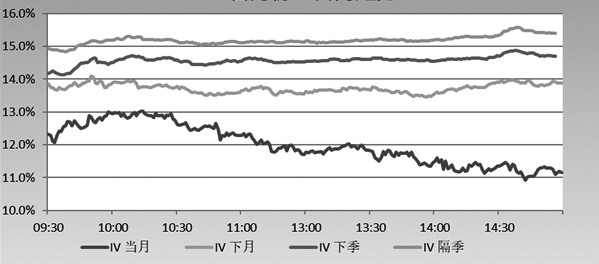 昨日标的50ETF振荡整理,当月IV快速回落,远月IV小幅拉升,其中下月IV相比前周增加近1.6个百分点,当前各月份IV值分别收于11.1%、13.9%、14.7%、15.4%,呈现近低远高的“升水期限结构”。与实现波动率相比,隐含波动率处于相对合理水平。