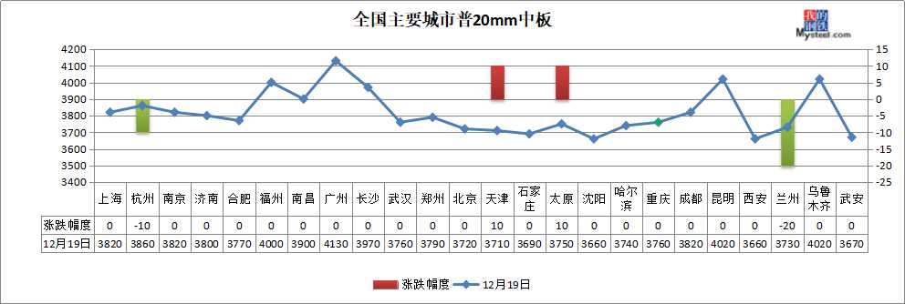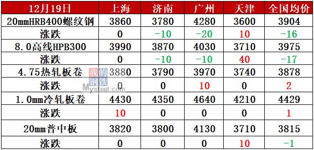中厚板:12月19日,全国24个主要城市20mm普板均价3815元/吨,较上个交易日下跌1元/吨。现货市场延续盘整态势,部分短缺规格有加价,整体市场成交一般。本周国内中厚板产量、厂库、社库三降,短期内供应端压力较小,下游需求尚可,但因市场操作谨慎,抑制了中厚板的价格上涨。贸易商目前对冬储意愿不强,仍需观察后期市场方向和走势,综合来看,短期内国内中厚板价格或继续震荡偏强运行。