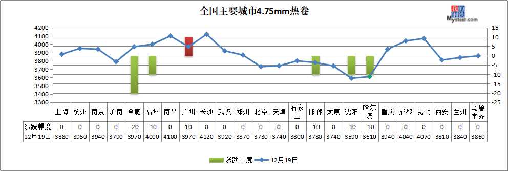 热轧板卷:12月19日,全国24个主要城市4.75mm热轧板卷均价3878元/吨,较上个交易日上涨2元/吨。今日黑色商品期货市场震荡走强,现货市场报价早盘暂稳,成交稍弱,午后随着盘面走强,商家报价稍显坚挺,成交暗降基本不再。今日本网数据发布,本周社会库存164.02万吨,周环比增加0.17万吨,钢厂产量本周增加0.11万吨,厂库下降0.40万吨。目前钢厂利润尚可,主动减产意愿不强,而市场需求表现韧性较强,预计年底之前高供应低库存情况很难改变。