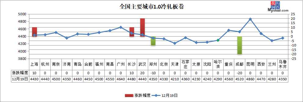 冷轧板卷:12月19日,全国24个主要城市1.0mm冷卷均价4429元/吨,较上个交易日上涨1元/吨。热卷期盘震荡,市场情绪回暖,不过热轧现货资源还是紧缺,传导到冷轧端缺货局面依旧,大部分贸易商认为短期冷轧价格坚挺,高位震荡可能性较大。库存方面,社库降0.44万吨,厂库增加0.39万吨,短期市场暂无大的库存压力。综合来看,预计明日全国冷轧板卷价格暂稳运行。