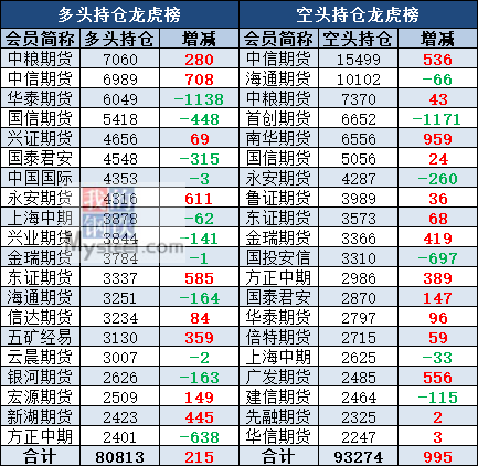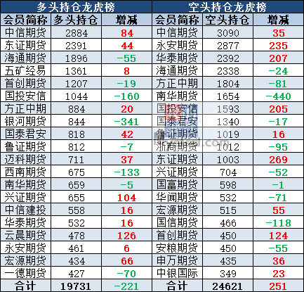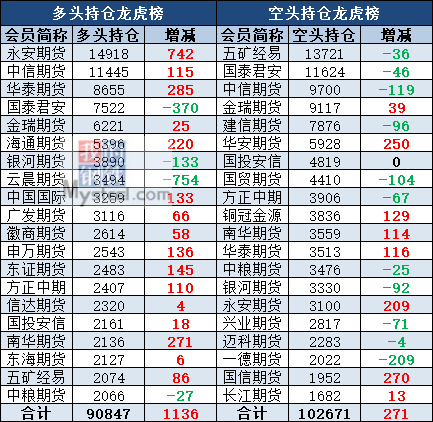 截至12月19日收盘,沪铜2002收49110,跌0.02%;沪铝2002收14200,涨1%;沪锌2002收18070,涨0.42%;沪铅2002收15070,涨1.28%;沪镍2002收110880,涨0.73%;沪锡2005收140100,涨0.46%。各品种持仓情况具体如下: