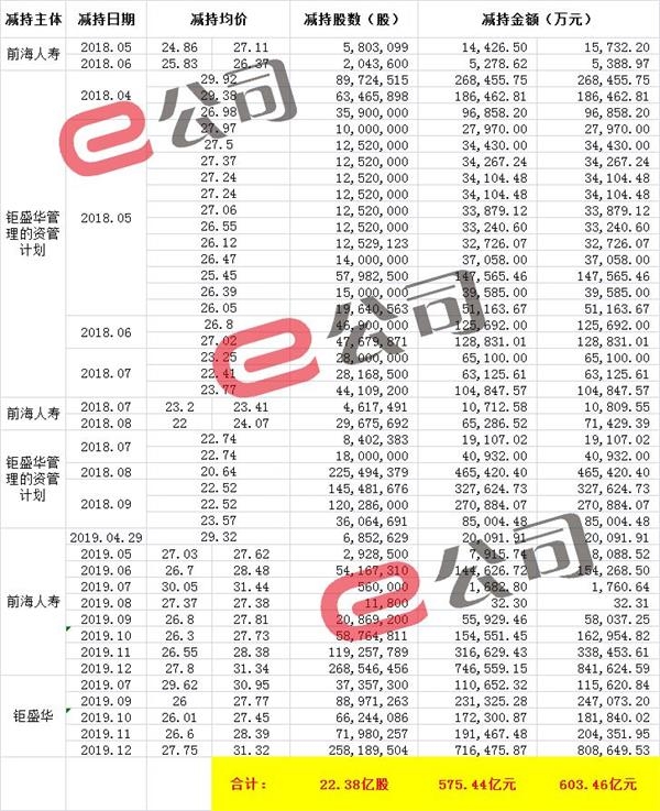 2019年5月~12月,前海人寿通过集中竞价方式累计卖出5.25亿股,减持金额142.79亿元~156.52亿元。2019年7月~12月,钜盛华通过集中竞价方式累计卖出5.23亿股,减持金额142.22亿元~155.75亿元。