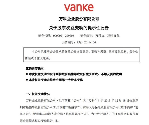 12月19日晚间,万科A公告,收到钜盛华及其一致行动人前海人寿的《简式权益变动报告书》。11月27日~12月19日,钜盛华、前海人寿通过集中竞价交易方式合计减持万科A股5.65亿股,占总股本的5%。此次减持后,钜盛华和前海人寿对万科的持股比例降至4.9999998%。