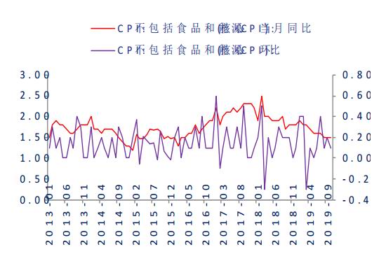 2019年10月份,CPI同比增长3.8%,环比上升0.9%。其中,CPI食品价格同比增长15.5%,环比上升3.6%;CPI非食品价格同比增长0.9%,环比上升0.2%。不包括食品和能源(核心CPI)同比增长1.5%,环比增长0.1%。