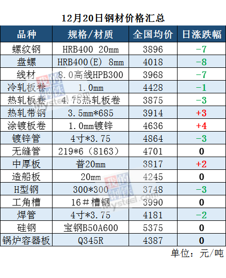 截至12月20日17:00,螺纹钢HRB400 20mm全国均价3896元/吨,跌7元/吨;线材8.0高线HPB300全国均价3968元/吨,跌7元/吨;冷轧板卷1.0mm全国均价4428元/吨,跌1元/吨;4.75热轧板卷全国均价3875元/吨,跌3元/吨;中厚板普20mm全国均价3817元/吨,涨2元/吨。