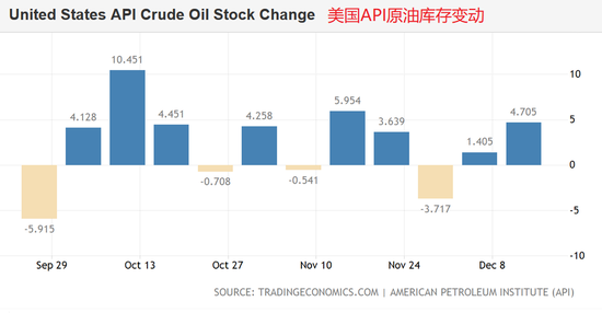 新浪财经12月20日讯,美国截至12月20日当周API原油库存变动将于12月25日公布。截至12月13日当周美国原油库存意外增加470万桶,市场预期减少192万桶,汽油和精炼油库存增幅均超出预期。