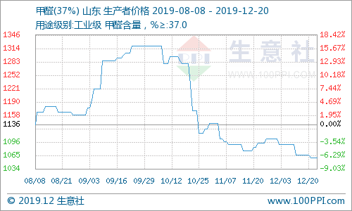 据生意社大宗商品榜数据显示,本周山东甲醛行情下跌,12月16日甲醛的均价为1066.67元/吨,20日甲醛的均价为1060.00元/吨,跌幅0.63%,当前价格同比去年下跌了15.54%。