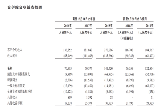 招股书显示,自2016年至2018年,赤子城科技营收从1.37亿元增长至2.77亿元,三年复合增长达率42.2%。今年,赤子城科技增速进一步提升:2019年上半年收入1.84亿元,同比增长58.0%;毛利1.23亿元,同比增长118.0%;经调整后净利近6254万元,同比增长88.3%。