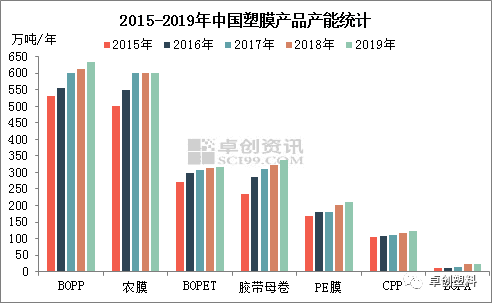 中国塑料薄膜行业产能持续扩增,区域分布以华东、华南、华北为主。据卓创预估,2019年中国塑料薄膜产量约为1478万吨,比2018年约增加30万吨,涨幅在2.07%。按产品来看,BOPP、胶带母卷、农膜及CPP产量小幅下降,农膜产量基本与2018年相持平,BOPA、PE膜等在2019年产量均有增多。卓创预测,未来5年,中国塑膜行业供应仍将持续增加,但增长速度有所放缓;下游需求量相应提升,但供应过剩的局面仍将持续。