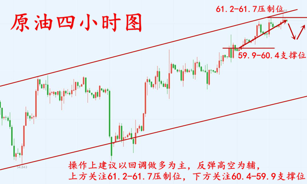 原油从四小时上来看,布林带三轨持续向上发散,均线依然收金叉,原油有继续向上突破的动能。周三原油EIA报告公布后,美布两油短线上扬。NYMEX最活跃WTI原油主力期货合约北京时间12月18日23:30-23:32三分钟内买卖盘面瞬间成交31874手,总价值近20亿美元合约。怡芯个人提醒广大投资朋友平时做单务必带好止盈止损,切勿重仓、满仓操作,养成良好的操作习惯,风险控制切记放在第一位。综合来看,下周操作上个人建议以回调做多为主,反弹高空为辅,上方短期重点关注61.2-61.7一线阻力,下方短期重点关注60.4-59.9一线支撑。