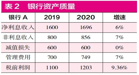 资产规模增速可以同步于广义货币(M2)的增速,即银行业的平均规模增速因子在8%左右;净息差持平或略有下降,呈现前低后高,全年净息差增速因子估计在-2%,结合银行业的规模增速看,明年净利息收入的增速有望达到6%;资管新规落地,理财子公司获批带动非利息收入增速恢复性反弹。近两年,有些银行的非利息收入受到资管新规影响,非利息收入增速显著放缓,明年部分获批开业的理财子公司或带动银行资管收入恢复性反弹;资产质量可控,银行减值计提力度不会进一步提升不要小看减值计提力度不变,若一家银行在营收保持增长的情况下,减值损失不增加,净利润增速就会高于营收增速,如表2所示,某银行A,利息收入增速6%,非利息收入增速7%,管理费用增速7%,减值损失0增长,则最终税前利润的增速为9.36%显著高于营收的增速6.33%。