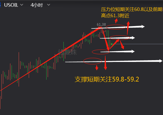 结合上面文章开头的分析,综合来看下周原油短期上方压力位关注60.8-61.3一线附近,下方支撑短期关注59.8-59.6,进一步关注59.2。高空为主,低多为辅。