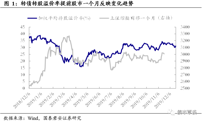 2019年以来,转债市场的估值变化基本都能提前一个月指引股市的方向。转股溢价率作为转债市场中最重要的估值指标之一,反应的是投资者对未来股市的预期。从今年的市场表现来看,转股溢价率的变化趋势基本提前一个月指引了股市未来的变化方向。如转股溢价率在5月份和7月份分别出现了一波提升,上证综指在6月份和8月份出现反弹;转股溢价率在8~11月份维持震荡,上证综指在9~12月份同样维持震荡行情。因此,如果我们将上证综指的走势向前平移一个月,可以发现,其和转债市场的转股溢价率走势基本保持一致。
