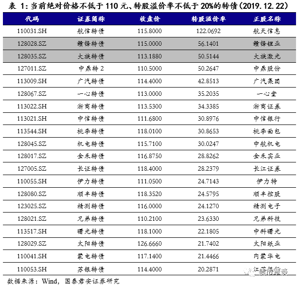 对于高绝对价格、高转股溢价率的优质个券,我们可以反向思考正股的上涨空间。由于转股溢价率较高,而且绝对价格不低,此时转债的吸引力远不如正股。而今年以来,转债的估值定位相对准确,后续大概率通过正股上涨来消化估值。因此,当前布局正股潜在的收益空间较大。我们以绝对价格不低于110元,转股溢价率不低于20%为筛选标准,挑选出20只相对优质的个券。相比转债而言,正股的上涨空间可能更大。其中,赣锋和大族的溢价率水平均超过了50%,我们看好其后续正股的上涨来消化当前的高估值。