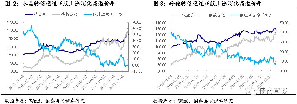另外从个券角度来看,一些高溢价率优质券最终通过正股上涨来消化估值。对于一些绝对价格不低的个券而言,长期维持高溢价率水平是不合理的,一般会有两种途径来消化高估值,一是通过正股上涨来完成,二是通过主动压缩来消化。当然,还有个别转债最后通过下修转股价来降低转股溢价率。2019年的转债市场中,出现了一批本身绝对价格处在高位,但同时转股溢价率并不低的个券,而从最终结果来看,这些个券通过后续正股持续上涨完成了估值压缩。如水晶转债在8月底时,转债价格接近120元,转股溢价率在20%附近;玲珑转债在8月中旬转债价格同样达到120元,转股溢价率接近20%。最终两只转债都通过后续正股上涨完成了估值消化。