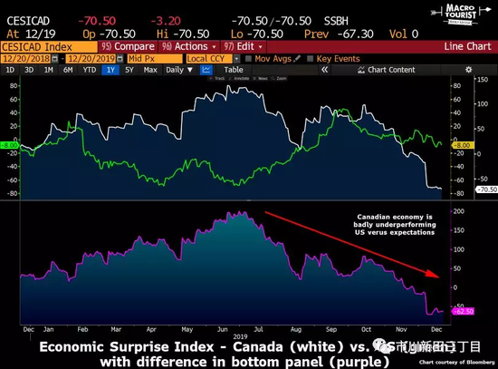 如果将美国和加拿大当前的经济表现与市场的预期做一个对比,可以清楚地看到美国经济正在明显的改善,而加拿大的经济形势却更加恶化。