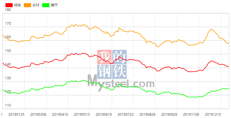 12月23日,国内钢材指数(Myspic)综合指数报140.86(绝对价格指数3982.5),较上一交易日下跌0.06%。其中,螺纹钢指数报153.01(绝对价格指数3867.6),较上一交易日下跌0.28%;热卷指数报138.74(绝对价格指数3890.3),较上一交易日上涨0.10%。