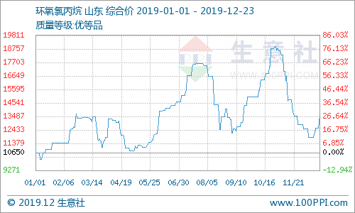 根据生意社监测的样本价格来看,2019年环氧氯丙烷市场价格震荡上行。截至到12月23日,环氧氯丙烷市场价格均价为13566.67元/吨,与年初报价的10650元/吨相比,报价上涨了2916.67元/吨,涨幅27.39%。